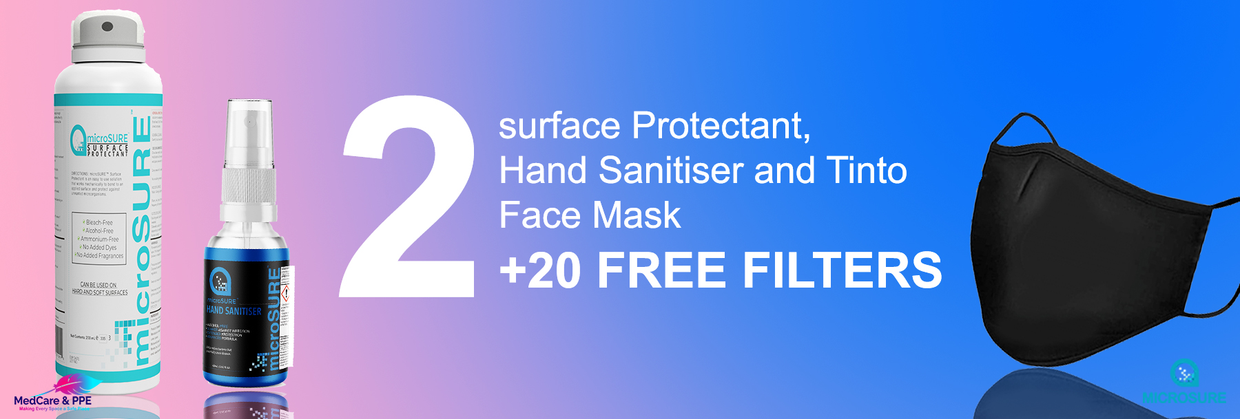2 Surface Protectant, 2 Hand Sanitiser, 2 Tinto Face Mask and 20 Free Filters