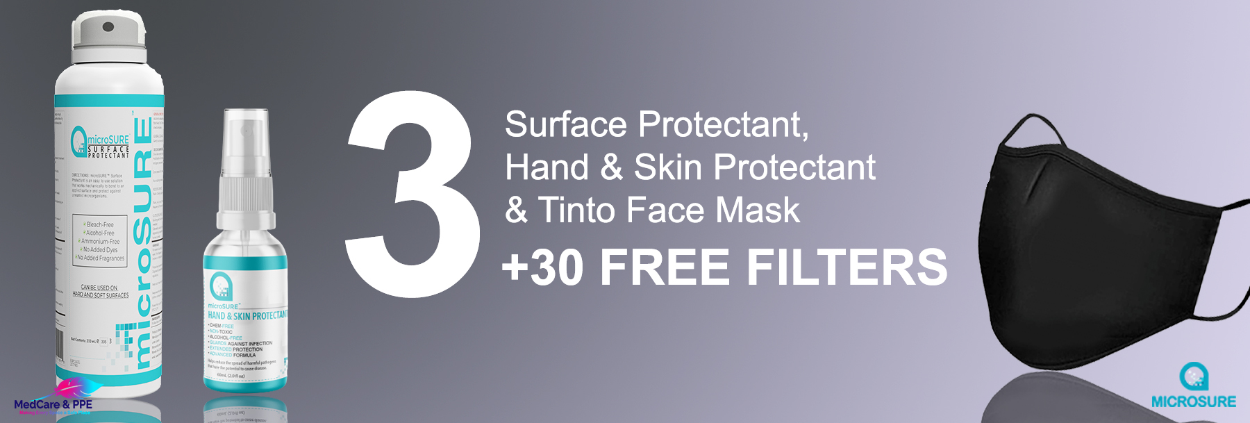 3 Surface Protectant, 3 Hand & Skin Protectant, 3 Tinto Face Mask and 30 Free Filters