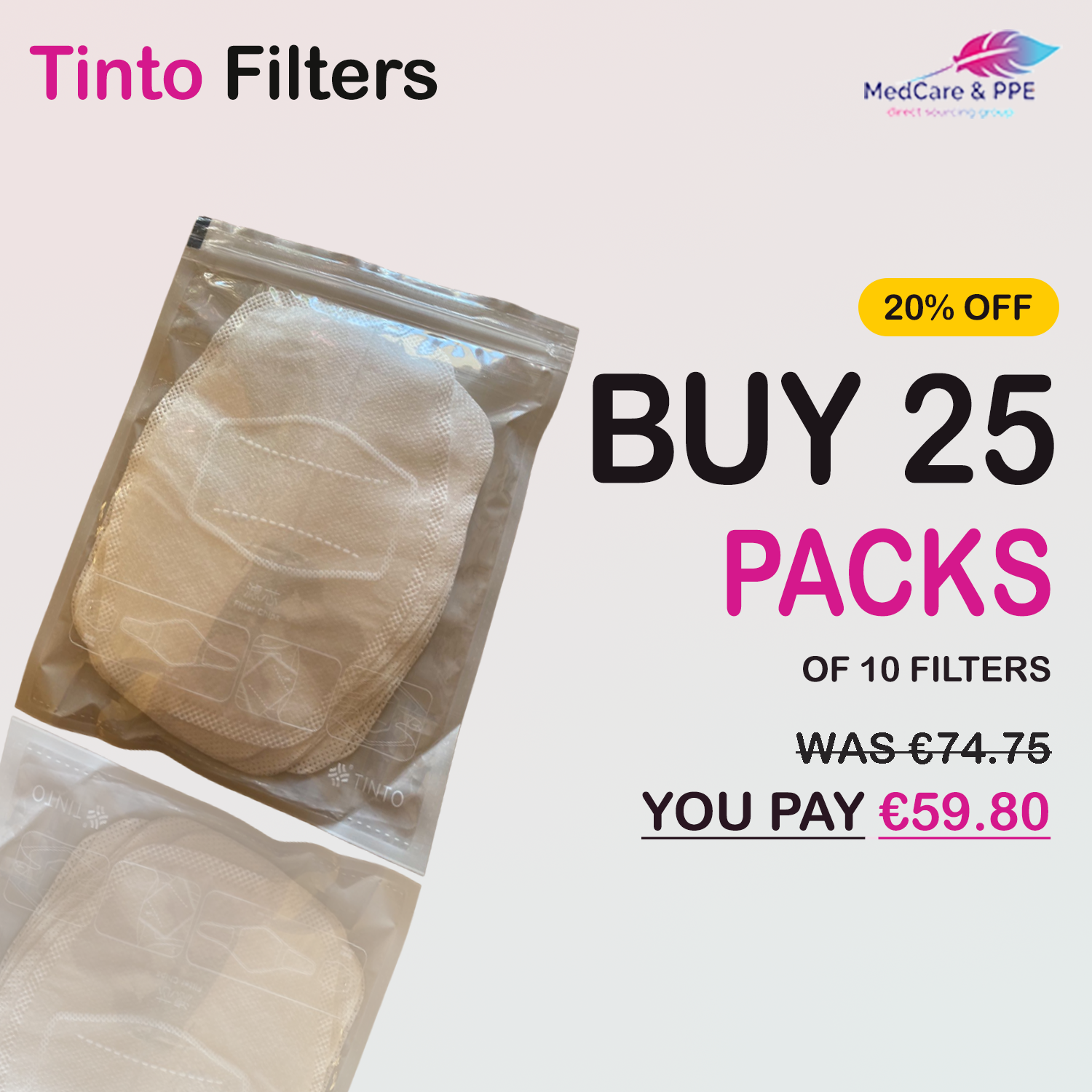 Filter packs available at Medcare and PPE are designed to work with various adult size face masks.
